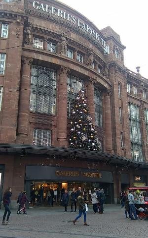 Strasbourg is a small city; big enough to have corporate offices and department stores, but small enough to navigate for a weekend. This is the department store Galleries Lafayette, all spruced up for Christmas.