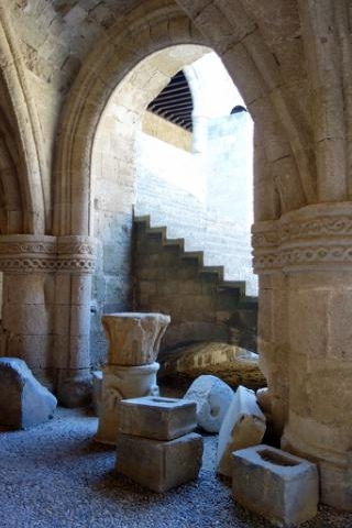 The stone alleyways of Rhodes Town, with medieval arches spanning the walls.