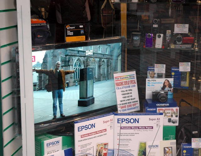 We noticed an electronics shop next to the cathedral with a camera trained on passersby. We immediately took advantage.