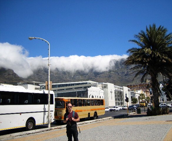 Matt in front of the tablecloth- the entire city and sky is summery and blue, but the mountain is in its own world.