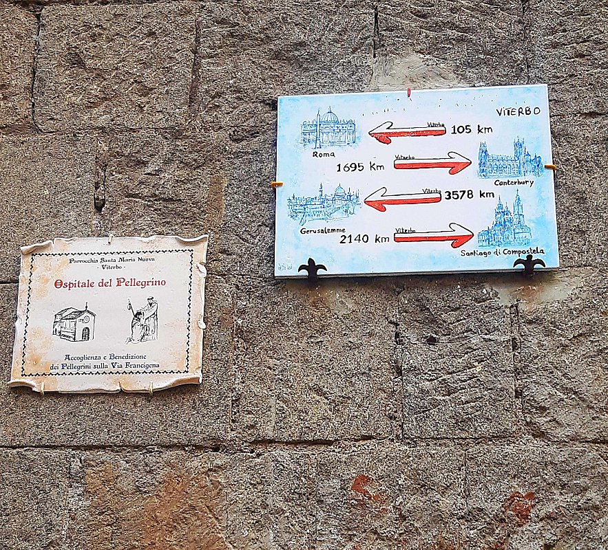 Our first glimpse of Via Francigena signage, in Piazza dei Pelligrini (Plaza of the Pilgrims).