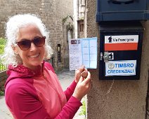 Getting my first timbro (stamp) in my Via Francigena credenziale (credential).