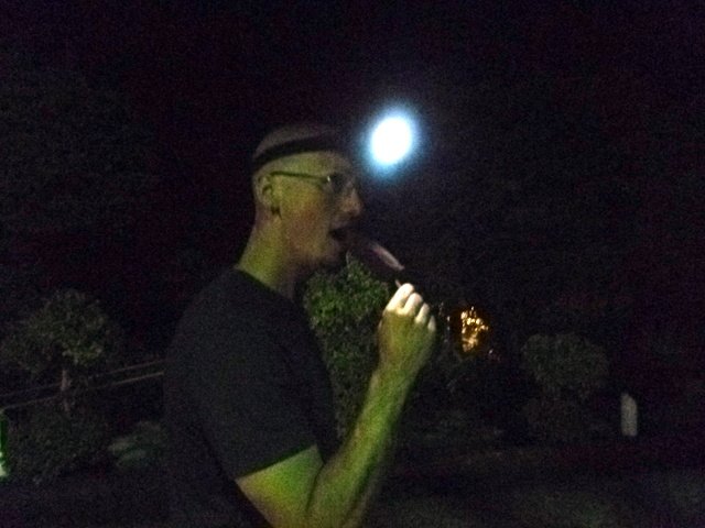 53 Enjoying a beer in the downpour.