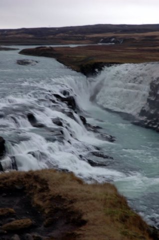 Approaching the waterfall. In spring and summer, Iceland is supposedly vibrant green; in winter it should be bright white. Without snow, it's just barren and brown.