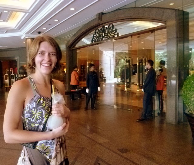 36 Loni got a taste of real Manila- a street vendor macheted a coconut for her, and served her the milk in a plastic bag.
