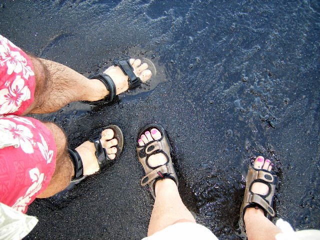 The black sand is made from volcanic pebbles.