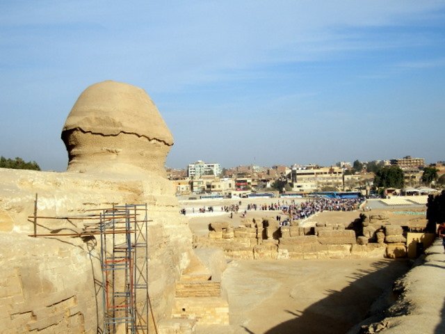 A side view of the Sphinx. To this day, nobody knows who built it, or when, or whose face it is.