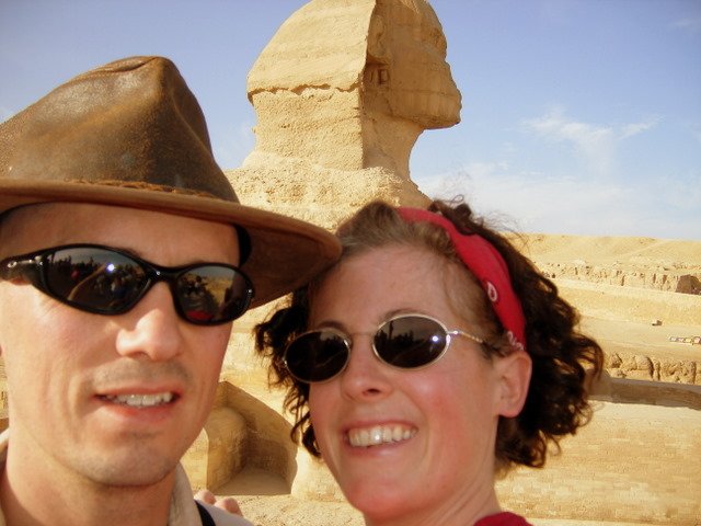 The Sphinx with a view of the Great Cheops Pyramid.