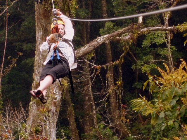 The guide transferred my carabiner from one zip line to another, so I could continue my ride.