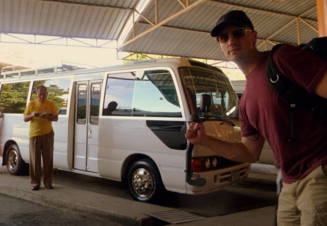 The next morning, we got on a bus departing Boquete. Note that public buses in Panama are often secondhand school buses, with TVs bolted to the front of the bus. Awesome.