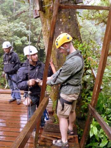 Matt patiently waits his turn to be carabiner'ed into the zip line.