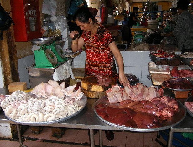 I don't know what amused me more- the fish, sold in these cute little baskets, or the vendor, curled up on the table with her feet up.