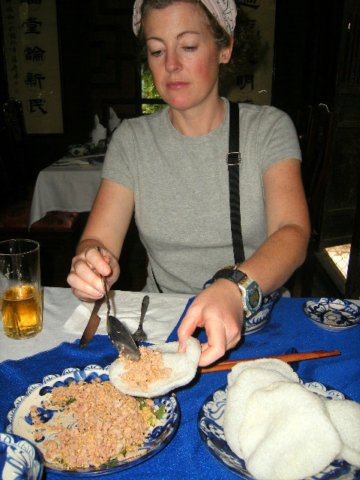 Fourth course: A Vietnamese specialty called "banh xeo," pronounced "bahn say-oh." Also known as Vietnamese pancake, Vietnamese omelet, Vietnamese Deliciousness. It is a rice paper wrapper around shrimp and pork and veggies. Yum.